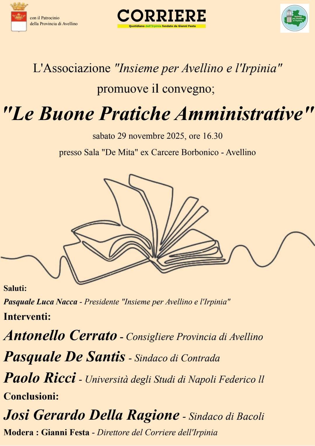 Sarà la sala blu del Carcere Borbonico ad accogliere sabato 29 Novembre, alle ore 16,30, il convegno promosso dall’associazione “Insieme per Avellino e l’Irpinia” dal titolo “le buone pratiche amministrative”. Una riflessione a tutto campo sul valore di cui si caricano le buone prassi che devono caratterizzare qualsiasi amministrazione, a partire dalla trasparenza e dall’efficienza, in risposta ai bisogni dei cittadini. Ad impreziosire ulteriormente il parterre il contributo del sindaco di Bacoli, Josi Gerardo Della Ragione, che Insieme per Avellino incontrerà nel pomeriggio per la presentazione del dossier per la candidatura a capitale italiana della cultura 2028.