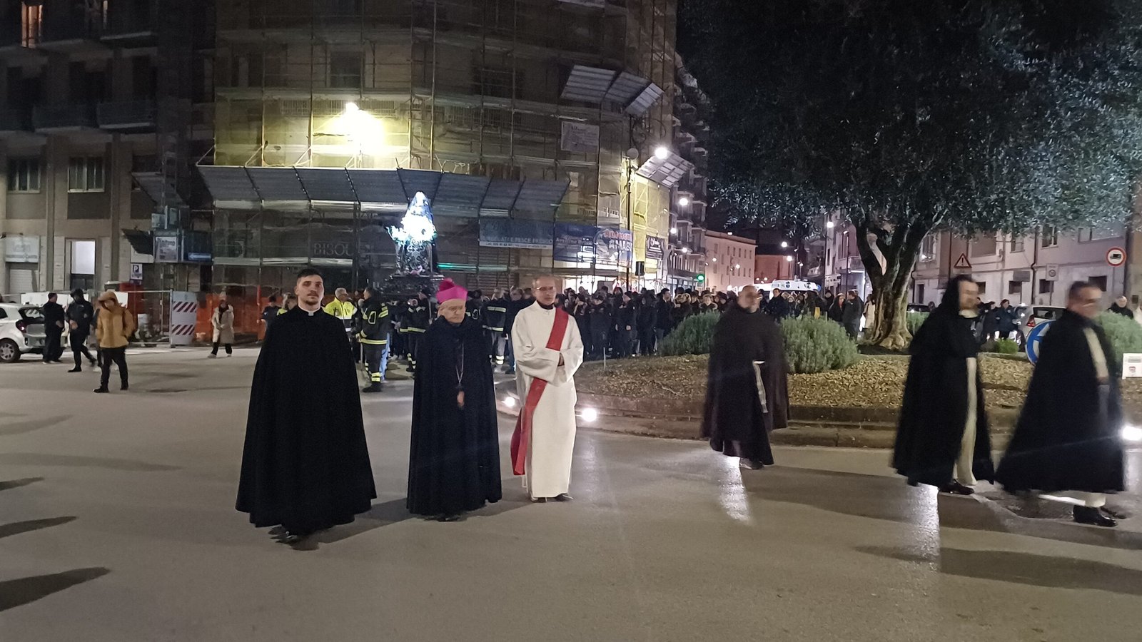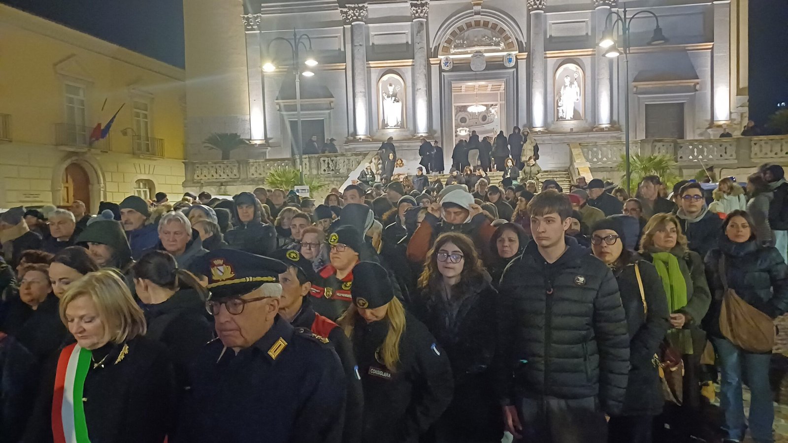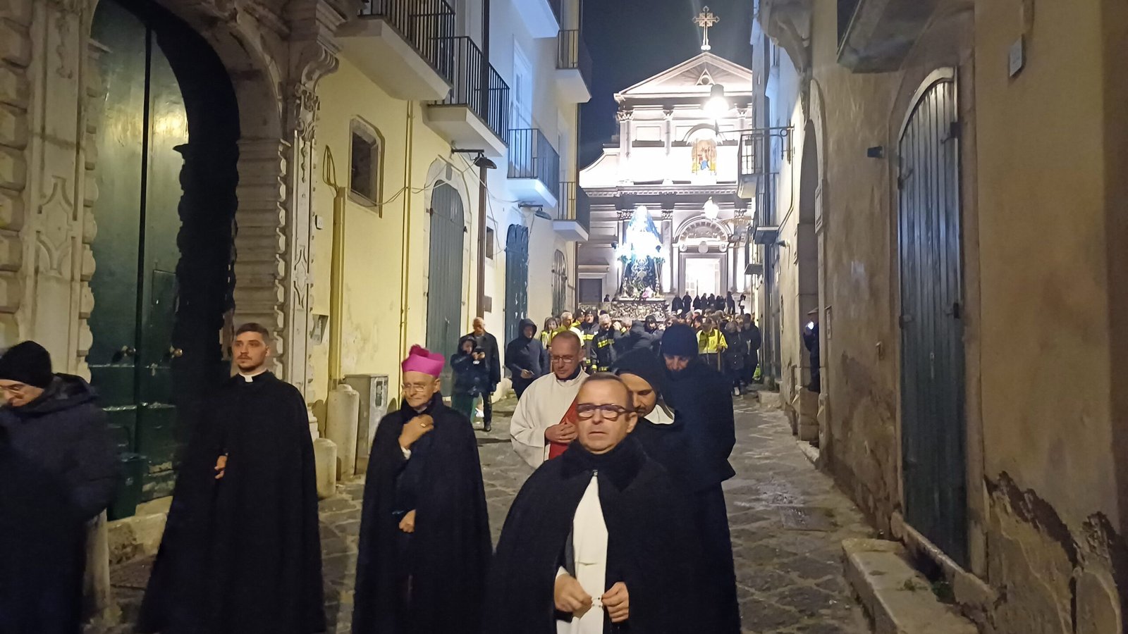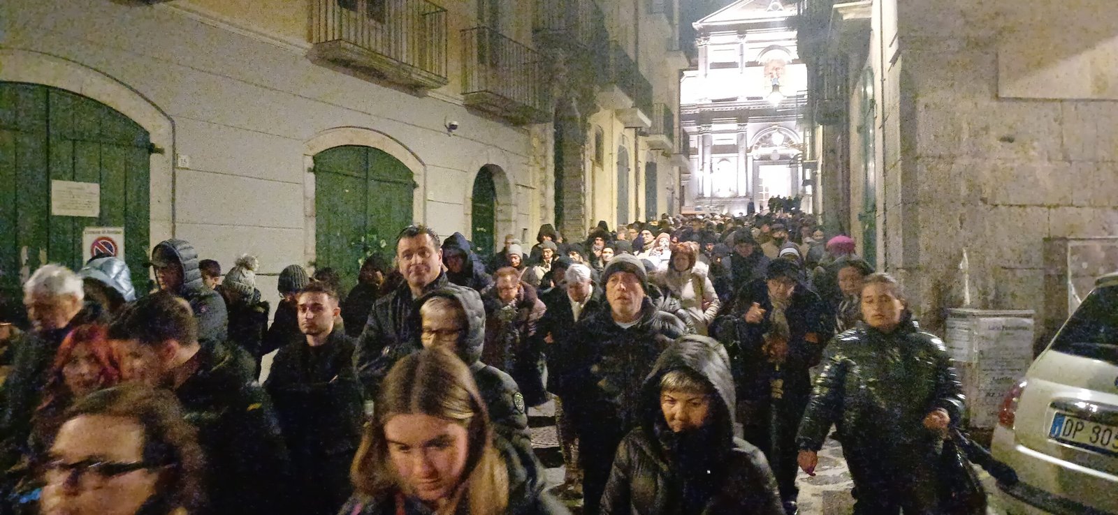 A garantire che tutto si svolga nel rispetto delle misure di sicurezza la Misericordia, la Polizia Municipale e i Vigili del fuoco. Ma la folla non è quella di sempre, qualcuno si lascia scoraggiare dal freddo e dall’ora tarda del rito. Malgrado ciò, sono comunque tanti i giovani e meno giovani, famiglie e coppie, con tanto di pettorina e ceri, al seguito del Cristo morto e dell’Addolorata, in un rito collettivo, del quale tutti hanno voglia di sentirsi parte. In prima fila a rappresentare l’amministrazione comunale il commissario prefettizio Giuliana Perrotta. Tra la folla anche l’unico candidato sindaco certo Gianluca Festa mentre non c’è quest’anno l’ex primo cittadino Laura Nargi. Ma è chiaro che la processione ha perso quella valenza di sfilata per i possibili candidati che aveva in passato ma è probabilmente un dato positivo. Ed è un vero lavoro di squadra a rendere possibile il corte con le associazioni cattoliche cittadine, dalla Gioventù francescana alla Misericordia, dal Movimento Bene Comune ai Focolari, dall’Azione Cattolica all’associazione mariana.