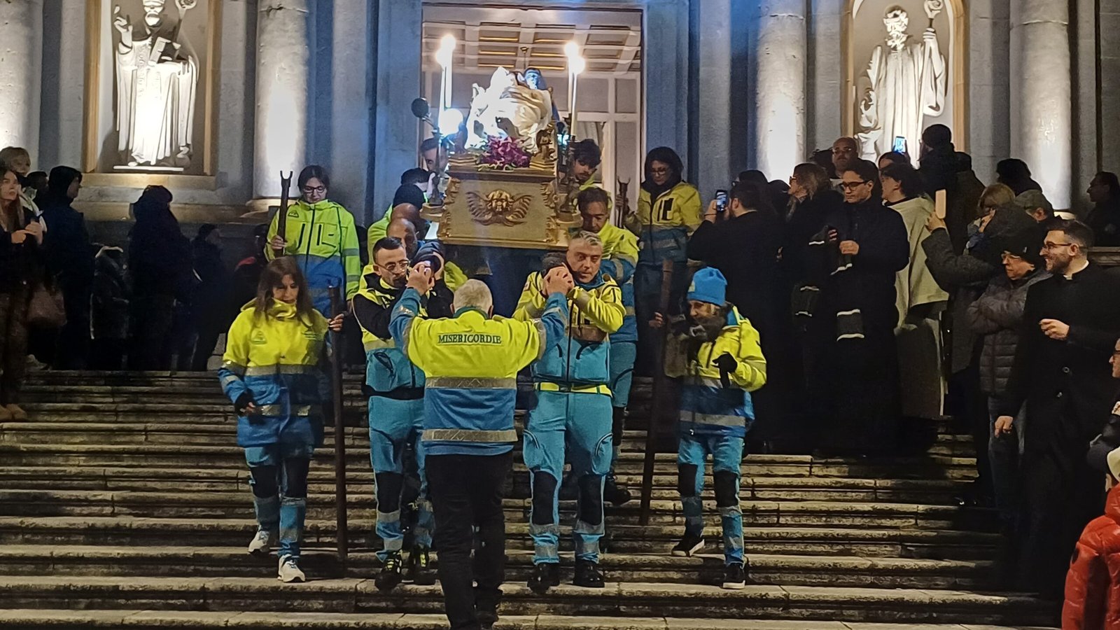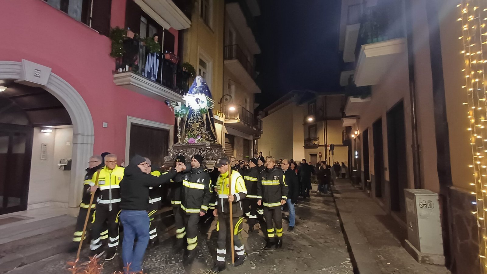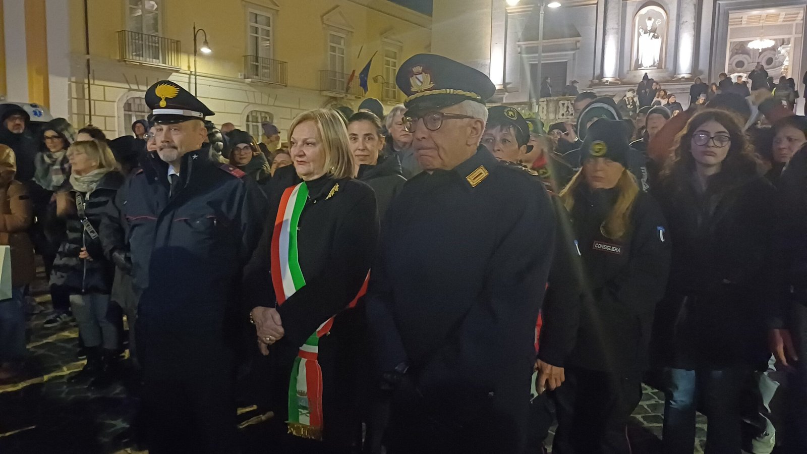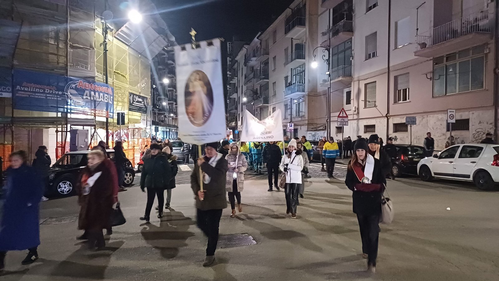 A garantire che tutto si svolga nel rispetto delle misure di sicurezza la Misericordia, la Polizia Municipale e i Vigili del fuoco. Ma la folla non è quella di sempre, qualcuno si lascia scoraggiare dal freddo e dall’ora tarda del rito. Malgrado ciò, sono comunque tanti i giovani e meno giovani, famiglie e coppie, con tanto di pettorina e ceri, al seguito del Cristo morto e dell’Addolorata, in un rito collettivo, del quale tutti hanno voglia di sentirsi parte. In prima fila a rappresentare l’amministrazione comunale il commissario prefettizio Giuliana Perrotta. Tra la folla anche l’unico candidato sindaco certo Gianluca Festa mentre non c’è quest’anno l’ex primo cittadino Laura Nargi. Ma è chiaro che la processione ha perso quella valenza di sfilata per i possibili candidati che aveva in passato ma è probabilmente un dato positivo. Ed è un vero lavoro di squadra a rendere possibile il corte con le associazioni cattoliche cittadine, dalla Gioventù francescana alla Misericordia, dal Movimento Bene Comune ai Focolari, dall’Azione Cattolica all’associazione mariana.