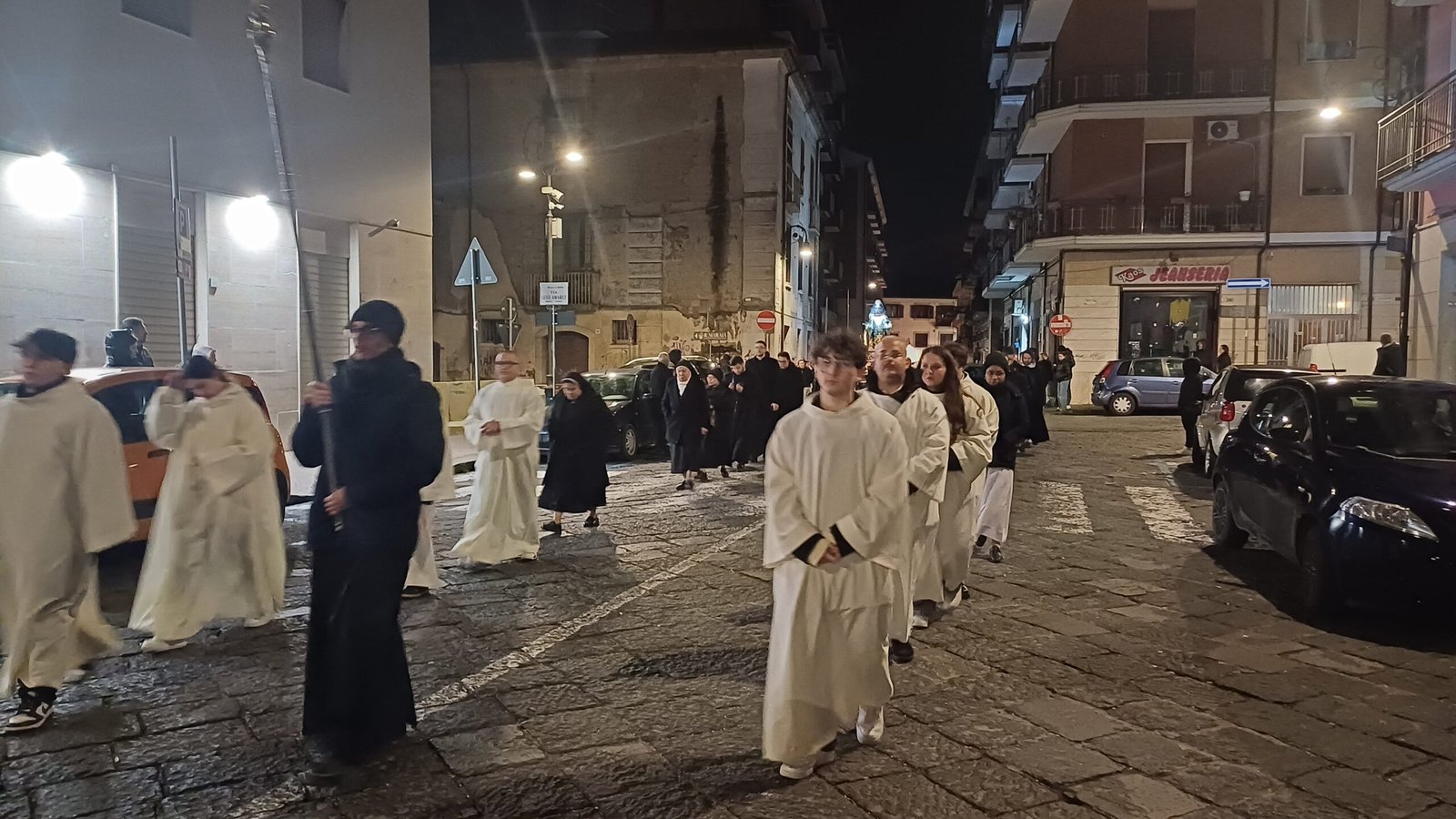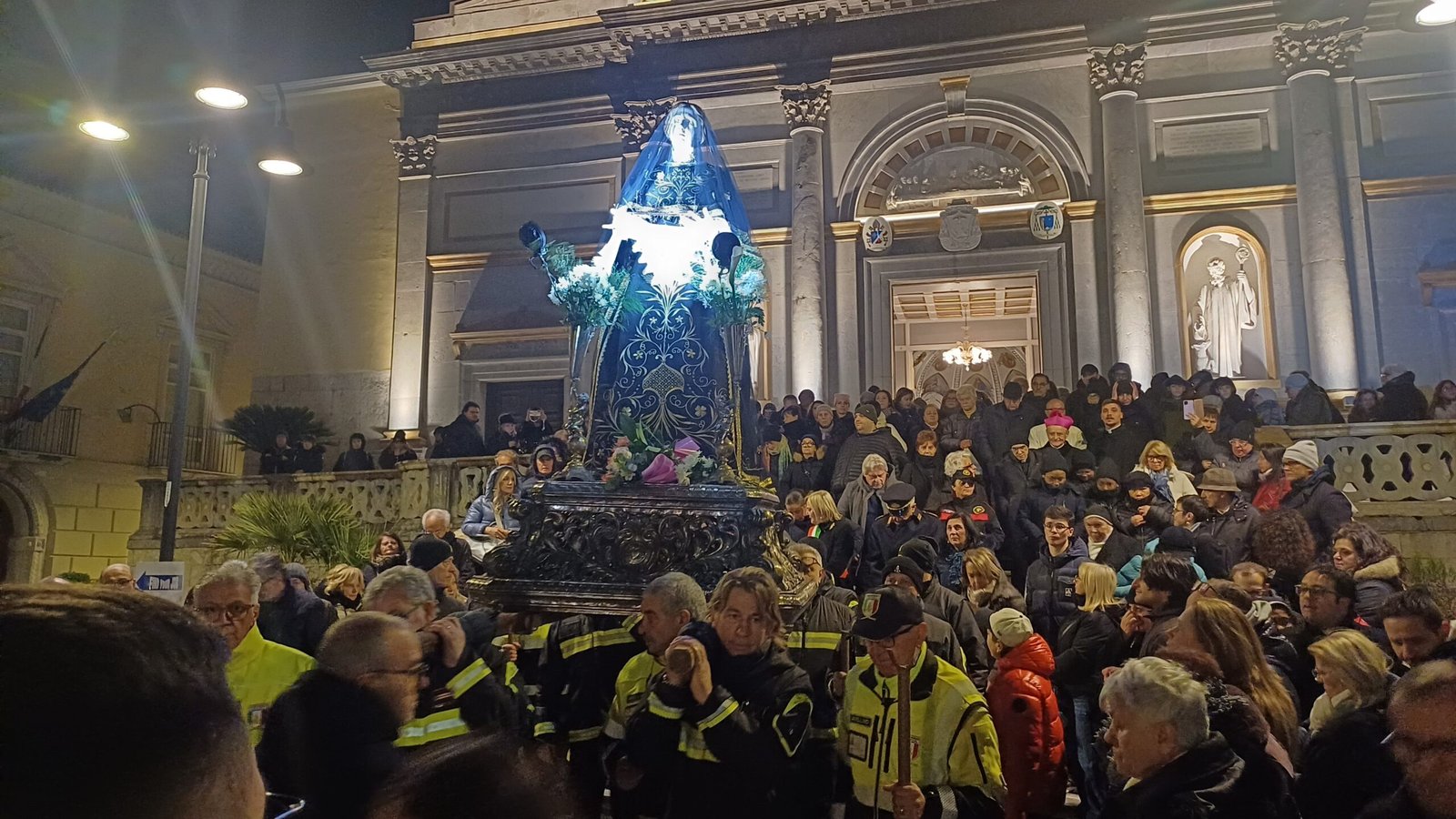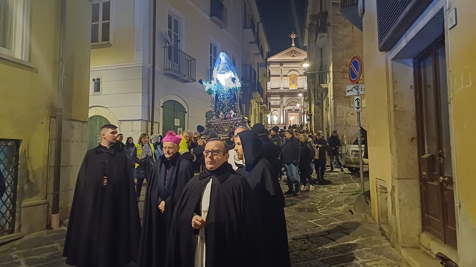 E’ ancora una volta la città, senza differenze di età o di schieramenti, a stringersi all’Addolorata, malgrado le temperature rigidissime, nella consueta processione del Venerdì Santo che esce dal Duomo passate le 20 ma conserva intatta la sua carica emozionale. Il vescovo Arturo Aiello invita ad avere coraggio “poichè al di là dei nostri limiti, tutto è stato già pagato” e lancia un messaggio di speranza, malgrado il complesso clima internazionale, richiamando al valore del pace “Anche la nostra città vive una Via Crucis ma alla fine del tunnel c’è la luce, ce lo ricorda Gesù con il Mistero della Resurrezione. L’ultima parola della storia non sarà la morte, malgrado il momento travagliato che oggi vive il mondo. Chiediamo che il Cristo ci aiuti a ritrovare l’umanità in una società sempre più disumanizzata, a rendere più umano il mondo, i giovani, le istituzioni”. Sottolinea come dalla Croce, dalle piaghe del Cristo arriva dalla salvezza e invita a riscoprire il valore del crocifisso nella propria casa. Pone l’accento sulla metafora del giardino, posto accanto al luogo della sepoltura, che caratterizza il racconto della Passione e si fa simbolo della convivenza pacifica possibile. E ricorda come la tunica di Gesù sia un richiamo forte alla Chiesa di cui “noi rappresentiamo i fili uniti dall’amore e che dobbiamo amare”. E sfida il gelo con la sua mantellina e uno scialle intorno al collo.