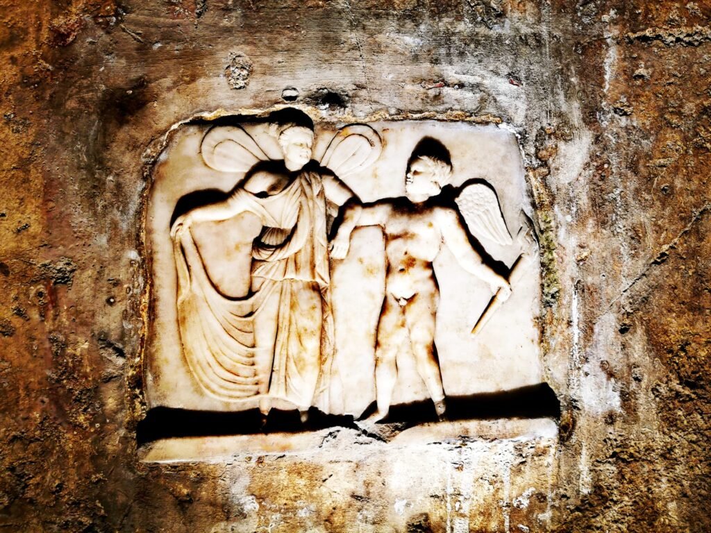 Come ricorderà Porfirio, inoltre, nei mitrei era predicata la dottrina della metempsicosi. Il “passaggio” delle anime (teoria già platonica) – spesso visualizzato con una “scala” a 7 pioli e una “porta”, come si vede in uno dei mitrei di Ostia (“Scala delle sette porte”) – è evocato in un singolare rilievo (“Eros e Psiche”) nel mitreo dell’antica Capua che rimanda al sesto grado; nello stesso tempio dove è richiamato anche il “rito della spada”. Segni e simboli che hanno attraversato i millenni e sono oggi presenti nelle logge e nei rituali della più grande comunione iniziatica del mondo, la massoneria, non a caso definita “arca vivente dei simboli”.