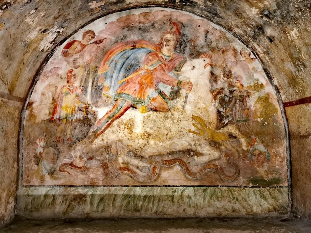 Alcune delle tante analogie sono testimoniate dall’archeologia. Il pasto comunitario rituale, ad esempio, è visibile su un rilievo trovato a Konjic (Bosnia), che mostra due colonne che racchiudono la scena (in una caverna). Un’agape è raffigurata anche su bassorilievo trovato a Ladenburg (Germania), nel quale si riconoscono anche una pagnotta incisa e dell’uva, simbolismo eucaristico rimarcato da Giustino di Nablus e condannato Tertulliano, due padri della Chiesa. Tra le eredità mitraiche, però, il cristianesimo smarrì subito le più esoteriche. Il culto orientale, tra l’altro, si caratterizzava per i sette gradi di iniziazione e un apparato simbolico fatto di divinità planetarie, oggetti sacri, figure del regno animale (compresa la colomba, nel secondo grado).