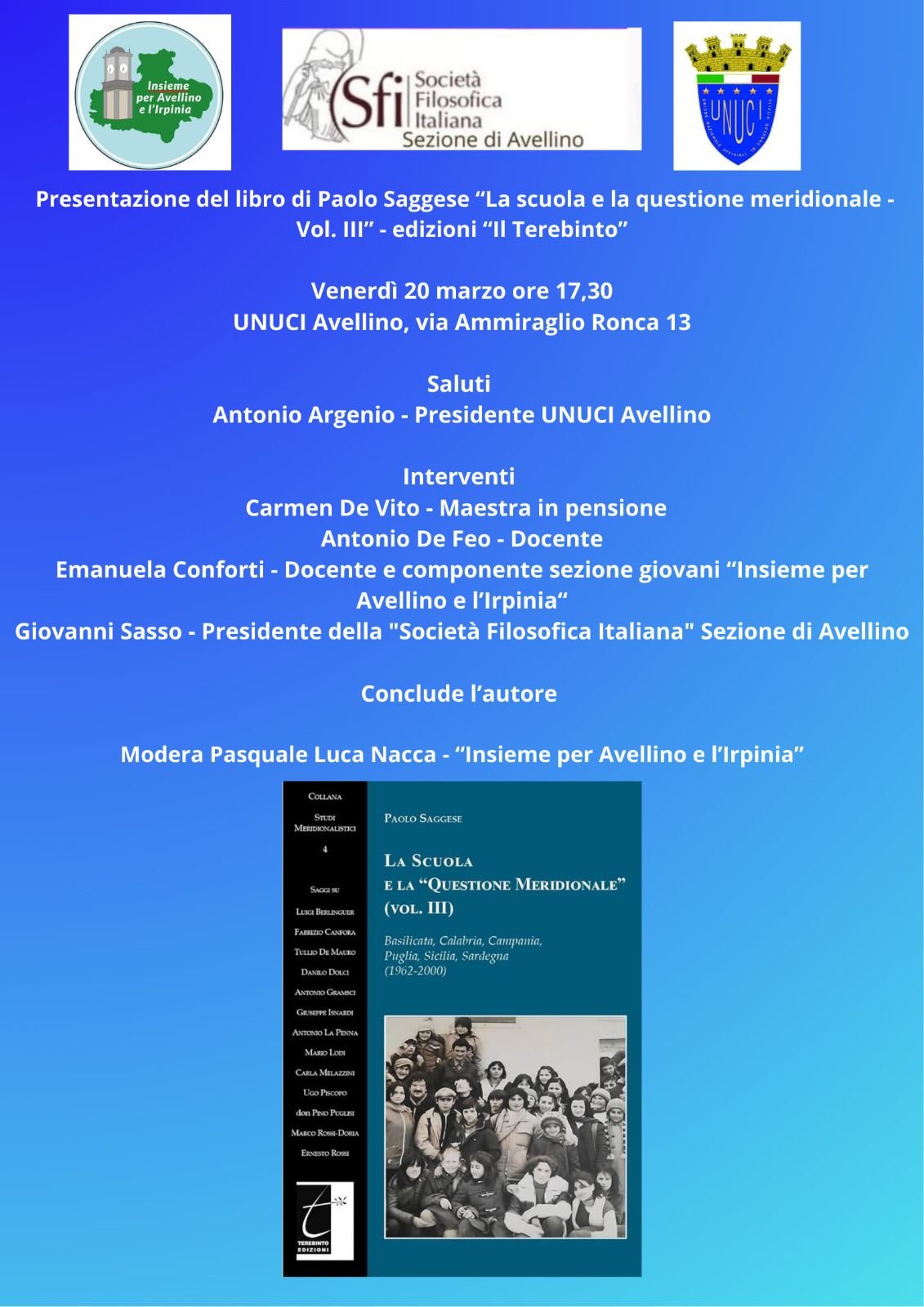 Sarà presentato venerdì 20 marzo alle ore 17.30, presso la sede dell’Unione Nazionale Ufficiali in Congedo d’Italia (UNUCI) di Avellino, in via Ammiraglio Ronca 13, il volume di Paolo Saggese “La scuola e la questione meridionale – Vol. III”, pubblicato dalla casa editrice Il Terebinto. L’iniziativa è promossa dall’associazione “Insieme per Avellino e l’Irpinia” in collaborazione con la Società Filosofica Italiana – Sezione di Avellino e con l’UNUCI.