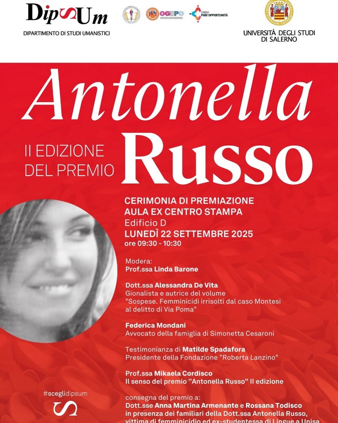 Un ricordo capace di rafforzarsi nel tempo, di dare sempre nuovi frutti, stabilendo un ponte tra passato e presente, testimoniando alle nuove generazioni come la strada da percorrere per contrastare la violenza di genere sia ancora lunga. E’ quello di Antonella Russo, studentessa della facoltà di lingua uccisa ad un passo dalla laurea per aver difeso la madre dal suo compagno violent, decorata con la medaglia d’oro al valore civile. Sarà l’aula ex Centro Stampa dell’Università di Salerno ad accogliere la seconda edizione del premio a lei intitolato. Interverranno Alessandra De Vita, autrice di “Sospese. Femmicidi irrisolti dal caso Montesi al delitto di via Poma”, Federica Mondani, avvocato della famiglia di Simonetta Cesaroni. A portare la sua testimonianza Matilde Spadafora, presidente Fondazione Roberta Lanzino. Sarà, poi, la professoressa Mikaela Cordisco a soffermarsi sul valore di cui si carica il premio. Seguirà la consegna del premio a Martina Armenante e Rossana Todisco, autrici di tesi dedicati alla violenza di genere, alla presenza dei familiari di Antonella.