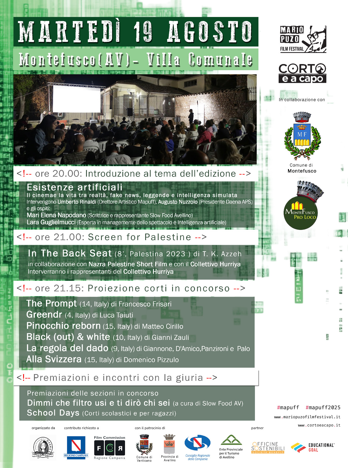 Si comincia martedì 19 agosto nella sala multimediale della casa comunale di Tufo con la proiezione dei cortometraggi in gara, valutati da una giuria popolare. In serata, alle 20, a Montefusco, in villa comunale, spazio a una tavola rotonda tra rappresentanti del festival, degli enti locali ed esperti di storie, narrazione e intelligenza artificiale. A guidare la riflessione saranno Umberto Rinaldi, Augusto Nuzzolo e due ospiti d’eccezione: la scrittrice Mari Elena Napodano e l’esperta di spettacolo e intelligenza artificiale Lara Guglielmucci. Alle 21 lo sguardo si sposterà sulla Palestina con la proiezione di In the Back Seat, corto del regista T. K. Azzeh, presentato in collaborazione con il Collettivo Hurriya, che sarà presente per dialogare con il pubblico. Subito dopo, alle ore 21.15, entreranno in scena i corti in concorso, firmati da giovani registi italiani che con il loro talento raccontano il presente con sguardi diversi, sorprendenti, intensi: The Prompt (14’, Italia) di Francesco Frisari Greendr (4’, Italia) di Luca Taiuti Pinocchio reborn (15’, Italia) di Matteo Cirillo Black (out) & White (10’, Italia) di Gianni Zauli La regola del dado (9’, Italia) di Giannone, D’Amico, Panzironi e Palo, Alla Svizzera (15’, Italia) di Domenico Pizzulo