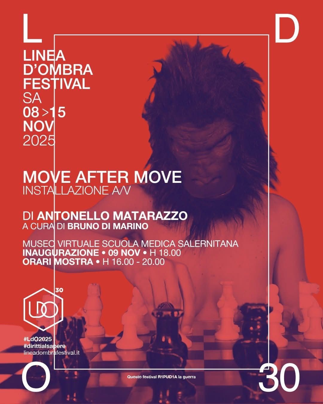 Una infinita partita a scacchi che il sapiens ha intrapreso con l’evoluzione da milioni di anni. E’ l’idea da cui nasce “Move after move” di Antonello Matarazzo, a cura di Bruno Di Marino, di scena dal 9 al 15 novembre, dalle 17 alle 21, al Museo Virtuale della Scuola Medica Salernitana, evento speciale al Linea d’ombra Festival, alla sua XXX edizione, Un’installazione video pluricanale che prende spunto dal film diretto da Antonello Matarazzo nel 2022, Pablo di Neanderthal (selezionato alla 79. Biennale di Venezia).