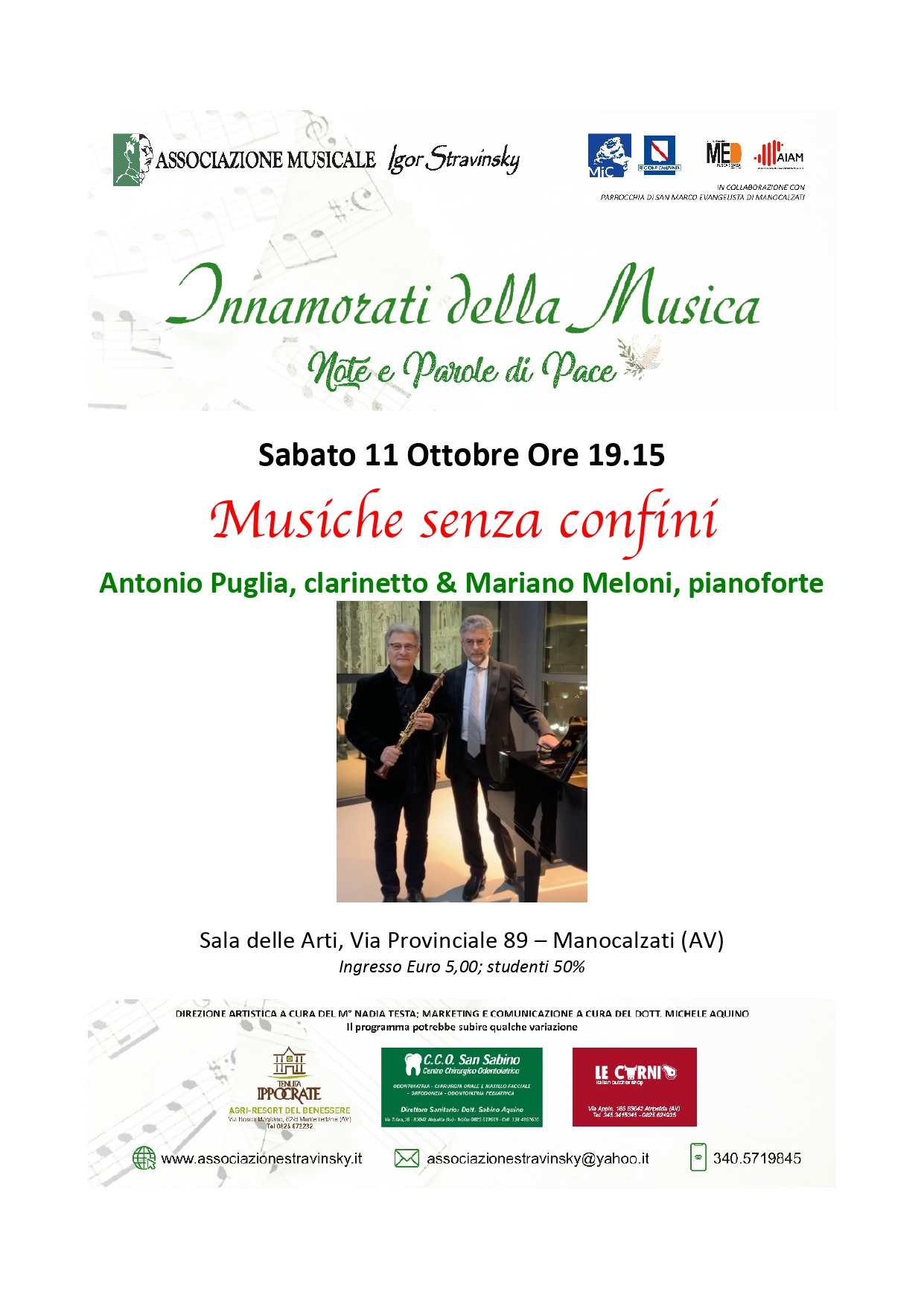 Dopo il grande successo del reading “Tacer cantando” di Enzo Decaro, dedicato all’amore impossibile tra Pasolini e la Callas, la stagione concertistica di ottobre di “Innamorati della Musica” dell’Associazione Igor Stravinsky di Avellino continua sabato 11 ottobre: la Sala delle Arti ospiterà alle ore 19.15 il Duo Mistral composto da Antonio Puglia al clarinetto e Mariano meloni al pianoforte che attraverso “Musiche senza confini” lanceranno il loro messaggio di Pace.