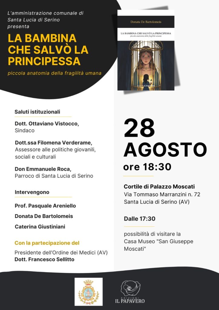 Sarà il giardino di Casa Moscati, a Santa Lucia di Serino, ad accogliere il 28 agosto, alle 18.30, la presentazione del libro “La bambina che salvò la principessa. Piccola anatomia della fragilità umana” di Donata De Bartolomeis, edito dalla casa editrice Il Papavero.
