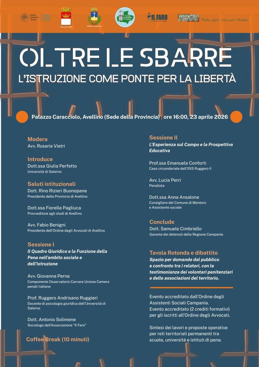 “Oltre le Sbarre: L’Istruzione come Ponte per la Libertà”. E’ il titolo del convegno in programma il 23 aprile, alle 16, a Palazzo Caracciolo Un momento di riflessione e confronto su un tema di grande rilevanza sociale ed educativa. A curare l’organizzazione la docente dell’Università di Salerno Giulia Perfetto “Ho sempre ritenuto fondamentale promuovere occasioni di dialogo che valorizzino il ruolo dell’istruzione quale strumento di inclusione, di crescita e di reale, concreta possibilità di reinserimento sociale, anche nei contesti penitenziari, quei contesti di cui poco si discute, poco si sa e poco si fa. A confrontarsi gli avvocati Giovanna Perna e Lucia Perri, Rino Rizieri Buonopane, Presidente della Provincia di Avellino, l’avvocato Fabio Benigni, Presidente dell’Ordine degli Avvocati di Avellino, Fiorella Pagliuca, dirigente dell’Ufficio Scolastico Provinciale, il Professore Ruggero Andrisano Ruggieri dell’Università di Salerno, il sociologo Antonio Solimene, Anna Ansalone, consigliera del Comune di Montoro, Emanuela Conforti, docente dell’IISS Ruggero II, presso la Casa Circondariale. Le conclusioni saranno affidate al Garante Regionale dei detenuti Samuele Ciambriello. Modera l’avvocato Rosaria Vietri. L’iniziativa rappresenta un’occasione preziosa per rafforzare il dialogo tra istituzioni, scuola, università e territorio, con l’auspicio di consolidare reti permanenti capaci di promuovere percorsi educativi efficaci anche all’interno degli istituti di pena.