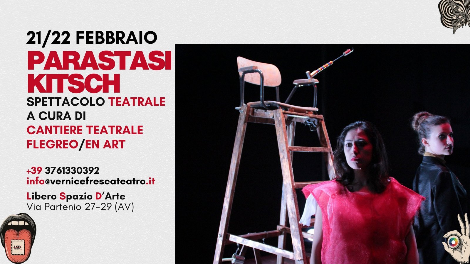 Gioca con il rovesciamento dei miti Parastasi Kitsch, spettacolo teatrale a cura di Cantiere Teatrale Flegreo / En Art, in scena sabato 21 febbraio alle ore 19.00 e domenica 22 febbraio alle ore 18.30 presso il Libero Spazio d’Arte di via Partenio, quinto appuntamento della rassegna FATTI D’ARTE, di e con Fabiana Fazio e Irene Grasso