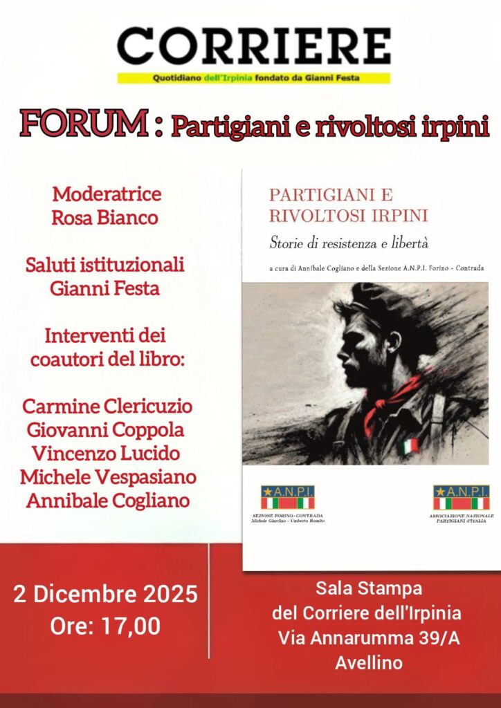 Nel cuore di Avellino, e più ampiamente dell’Irpinia, si scrive un pezzo di storia che troppo a lungo è rimasto fra polverosi faldoni d’archivio e nostalgiche reminiscenze familiari. Il prossimo 2 dicembre 2025, nella Sala Stampa del Corriere dell’Irpinia, in Via Annarumma 39/A ad Avellino, alle ore 17:00, la presentazione del volume Partigiani e Rivoltosi Irpini. Storie di resistenza e libertà si trasforma in un Forum — luogo di incontro fra passato e presente, memoria e impegno — promosso dal Corriere dell’Irpinia .