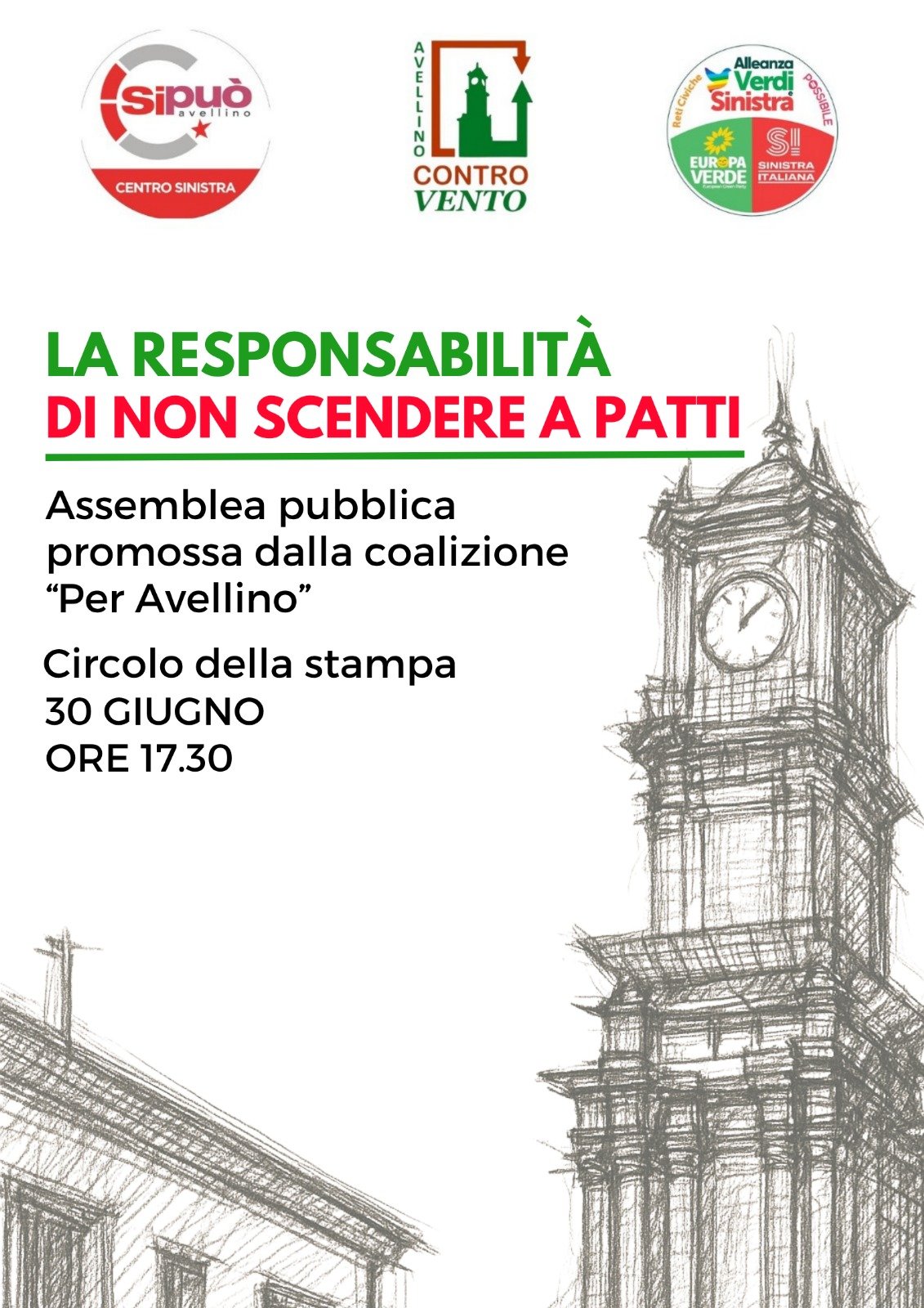 “La responsabilità di non scendere a patti“. E’ il tema dell’assemblea pubblica promossa dalla coalizione “Per Avellino”. A comporre la formazione Si può Centro Sinistra, Avellino Contro Vento, Alleanza Verdi Sinistra, reti civiche, Possibile, Europa Verde, Sinistra Italiana. L’appuntamento è per lunedì 30 giugno alle 17.30 al Circolo della Stampa di Avellino.