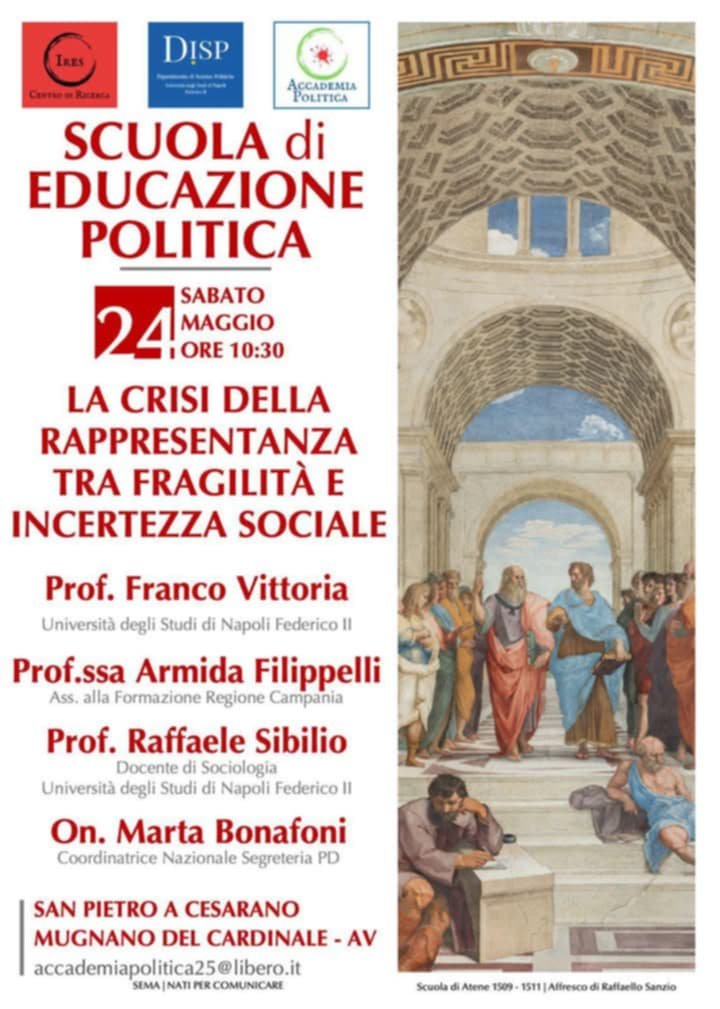 Il 24 maggio 2025, a Mugnano del Cardinale, presso San Pietro a Cesarano, si terrà la sesta lezione della Scuola di Educazione Politica, diretta dal Prof. Franco Vittoria. Questo appuntamento, dedicato a “La crisi della rappresentanza tra fragilità e incertezza sociale”, non sarà semplicemente un convegno, ma una meditazione collettiva sul destino della democrazia, un esercizio di pensiero critico che intende restituire profondità all’idea di politica come cura dell’essere comune.