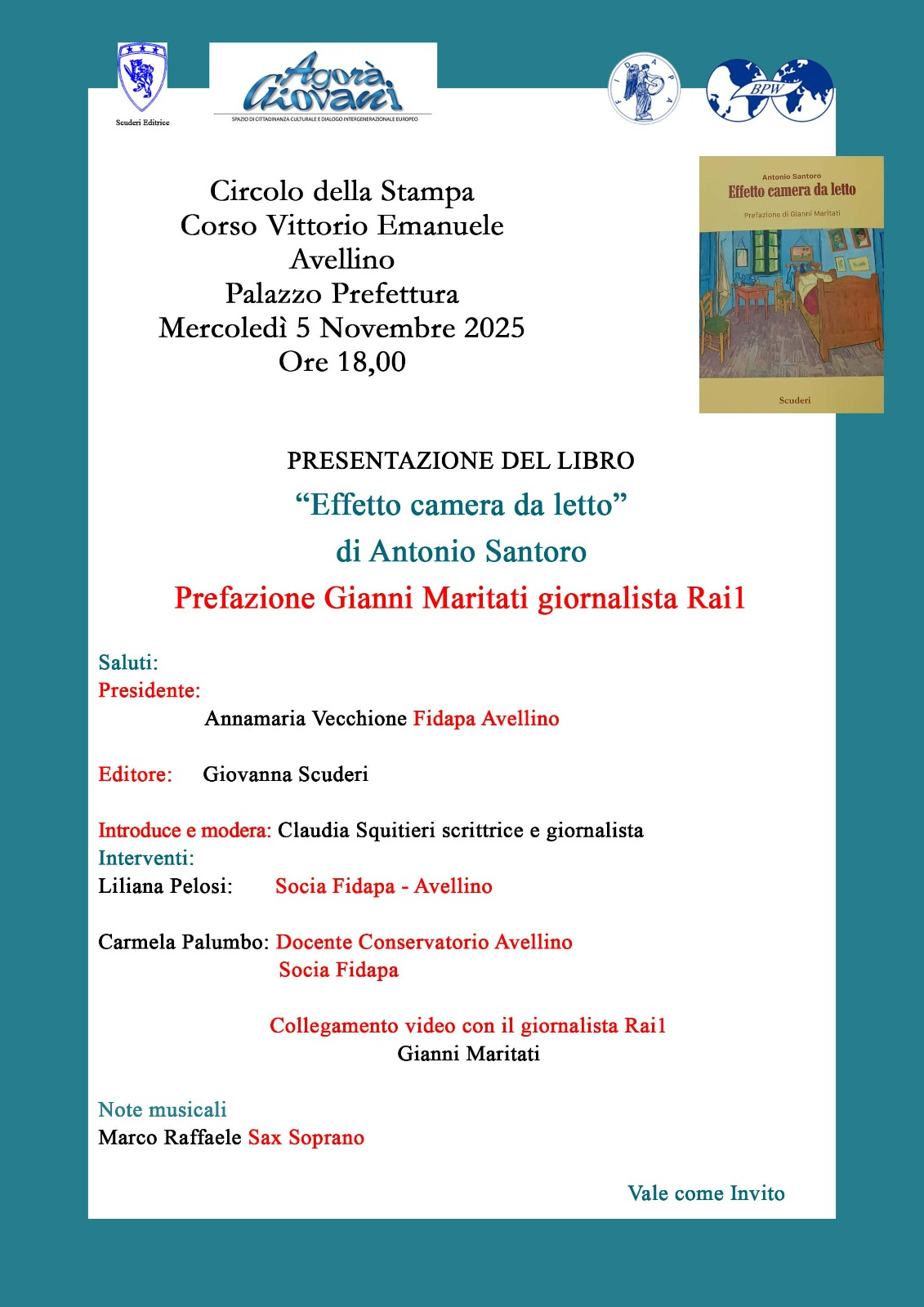 Sarà presentato mercoledì 5 novembre, alle 18, presso il Circolo della Stampa di Avellino, il libro “Effetto camera da letto” di Antonio Santoro, edito da Scuderi. Ad impreziosire il volume la prefazione del giornalista Rai Gianni Maritati. L’incontro, organizzato nell’ambito delle attività promosse da Agorà Giovani, sarà aperto dai saluti di Annamaria Vecchione, presidente della Fidapa Avellino. Seguirà l’intervento dell’editrice Giovanna Scuderi. A introdurre e moderare la serata sarà Claudia Squitieri, scrittrice e giornalista. Interverranno inoltre Liliana Pelosi, socia Fidapa Avellino, e Carmela Palumbo, docente del Conservatorio di Avellino e socia Fidapa. Interverrà in collegamento video con Gianni Maritati, giornalista Rai1 e autore della prefazione del volume. La serata sarà accompagnata da momenti musicali a cura di Marco Raffaele al sax soprano.