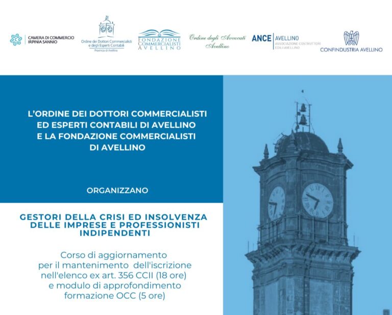 Gestire la crisi, costruire soluzioni. L’Ordine dei Dottori Commercialisti e degli Esperti Contabili di Avellino, insieme alla Fondazione Commercialisti Avellino, annuncia l’avvio del Corso di aggiornamento per il mantenimento dell’iscrizione nell’elenco ex art. 356 CCII (18 ore) e del modulo di approfondimento formazione OCC (5 ore). Il percorso formativo, patrocinato da ANCE Avellino, Camera di Commercio Irpinia Sannio, Confindustria Avellino e Ordine degli Avvocati di Avellino, si articola…