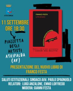 Sarà presentato l’11 settembre, alle 18.30, nella piazzetta degli artisti di Atripalda, il romanzo di Franco Festa “La fine del gioco”, Robin edizioni. A portare i propri saluti il sindaco Paolo Spagnuolo. Relazioneranno Luigi Anzalone ed Emilio Loffredo, Modera il…