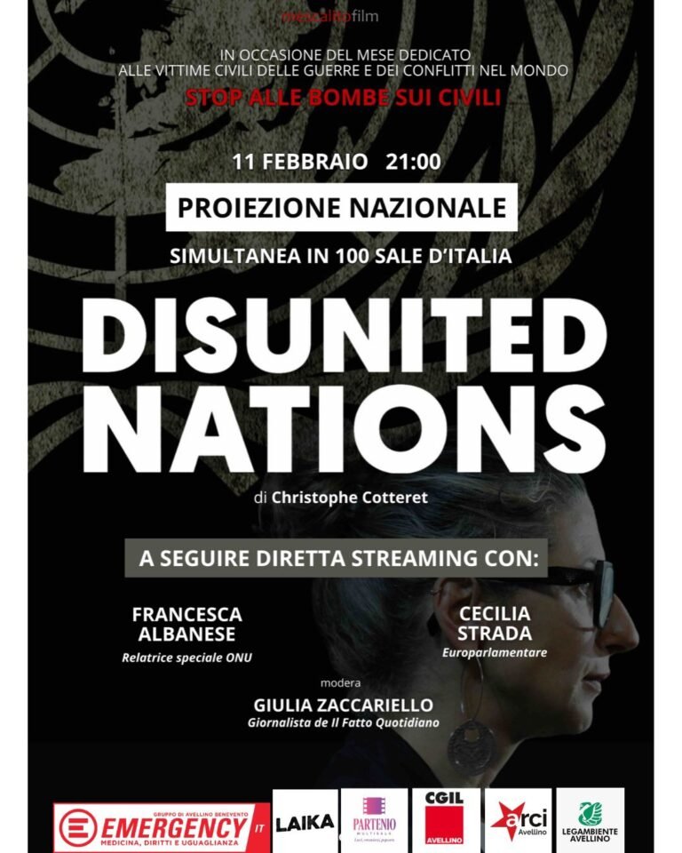 Mercoledì 11 febbraio, il Cinema Partenio di Avellino sarà tra le 100 sale in cui verrà proiettato simultaneamente il film Disunite Nations di Christophe Cotteret presso il Multisala Cinema Partenio: la Cgil di Avellino, Arci Provinciale, Emergency Avellino-Benevento, Legambiente Avellino, l’associazione Laika Aps aderiscono alla proiezione simultanea. Nel marzo 2024, Francesca Albanese, Relatrice Speciale delle Nazioni Unite per i Territori…