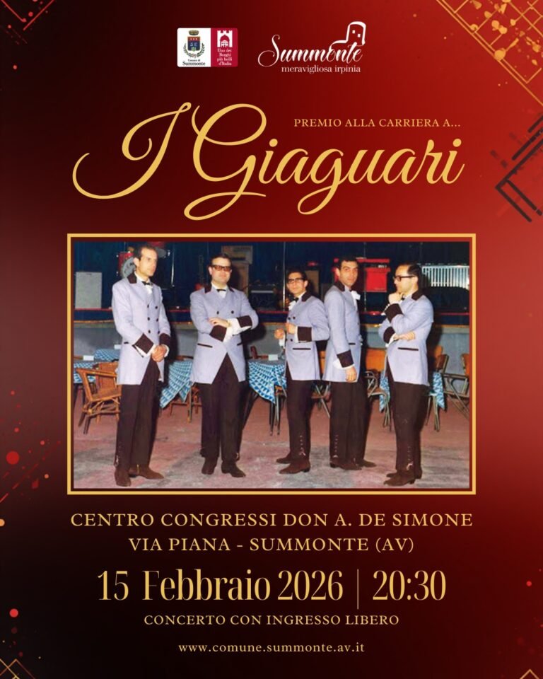 Il Comune di Summonte conferisce il Premio alla Carriera ai “Giaguari”, storica formazione musicale che ha segnato un’importante pagina della scena artistica locale e non solo. L’evento si terrà domenica 15 febbraio 2026, alle ore 20:30, presso il Centro Congressi Don Alberto De Simone in Via Piana, a Summonte (AV), e sarà accompagnato da un concerto con ingresso libero, aperto…