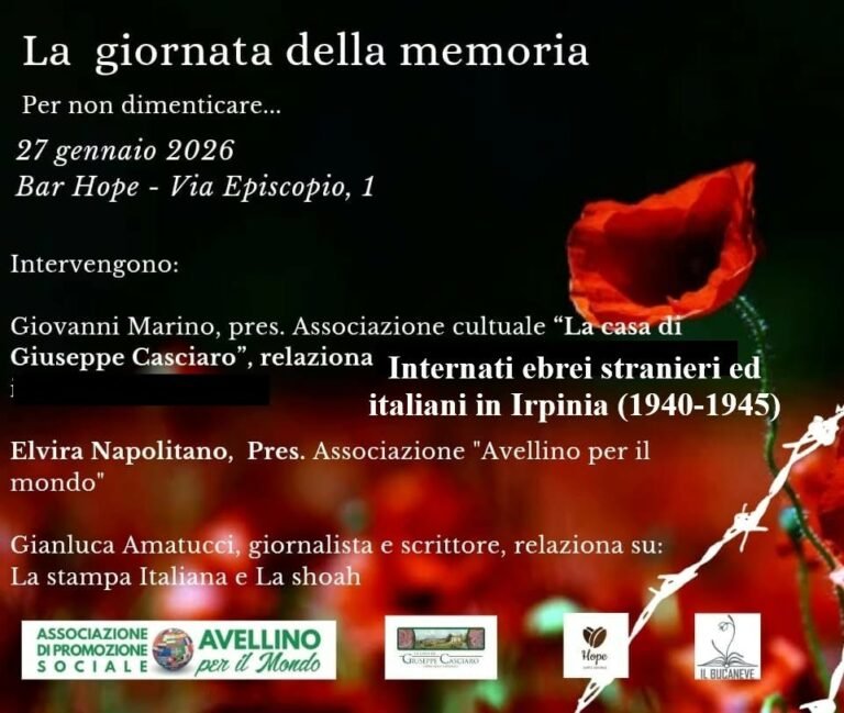 Nasce dall’imperativo di non dimenticare, in occasione della “Giornata della memoria”, il convegno organizzato presso il caffè solidale “Hope”, in programma il 27 gennaio, a partire dalle 17.30. A moderare l’evento sarà Gianluca Amatucci. A portare i propri saluti Elvira Napoletano, Vice presidente APS “Avellino per il Mondo”. Sarà Giovanni Marino, presidente dell’associazione culturale “La casa di Giuseppe Casciaro” a…