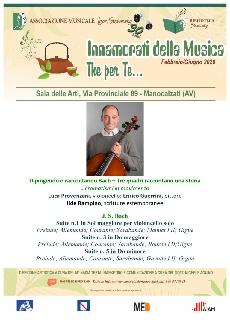 Dopo la standing ovation meritatamente attribuita al Quartetto Enarxis, composto dai giovanissimi percussionisti Martina D’Onofrio, Francesco Romano, Giuseppe Alfieri e Alessandro Romano, in occasione del taglio del nastro di Innamorati della Musica 2026, la prestigiosa rassegna siglata STRAVINSKY prosegue domenica 15 febbraio con il recital del violoncellista Luca Provenzani (docente al Conservatorio Mascagni di Livorno e a lungo primo violoncello dell’ORT – Orchestra della Toscana, collaboratore in qualità di…