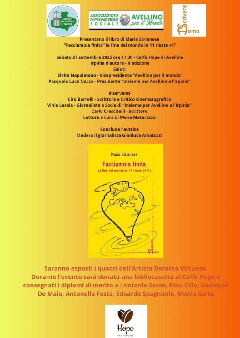 Riparte, alla sua seconda edizione Irpinia d’autore promossa da “Insieme per Avellino e l’Irpinia”. Sabato 27 Settembre, alle 17.30, presso il caffè Hope di Avellino appuntamento con la presentazione del libro di Maria Strianese “Facciamola finita – la fine del mondo in 11 risate+1”. Ogni racconto, si legge nelle note che accompagnano il volume, è una strampalata ipotesi di fine…