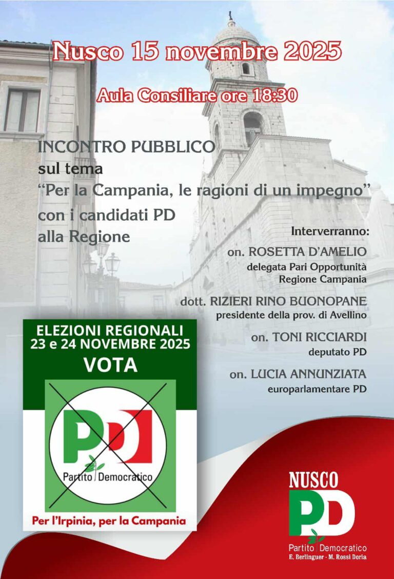 Sarà l’aula consiliare di Nusco ad accogliere il 15 novembre un confronto dal titolo “Per la Campania, le ragioni di un impegno” con i candidati del Pd. Interverranno Rosetta D’Amelio, delegata Pari Opportunità della Regione, Rizieri Buonopane, presidente della Provincia di Avellino, Toni Ricciardi del Pd, Lucia Annunziata, parlamentare Pd.
