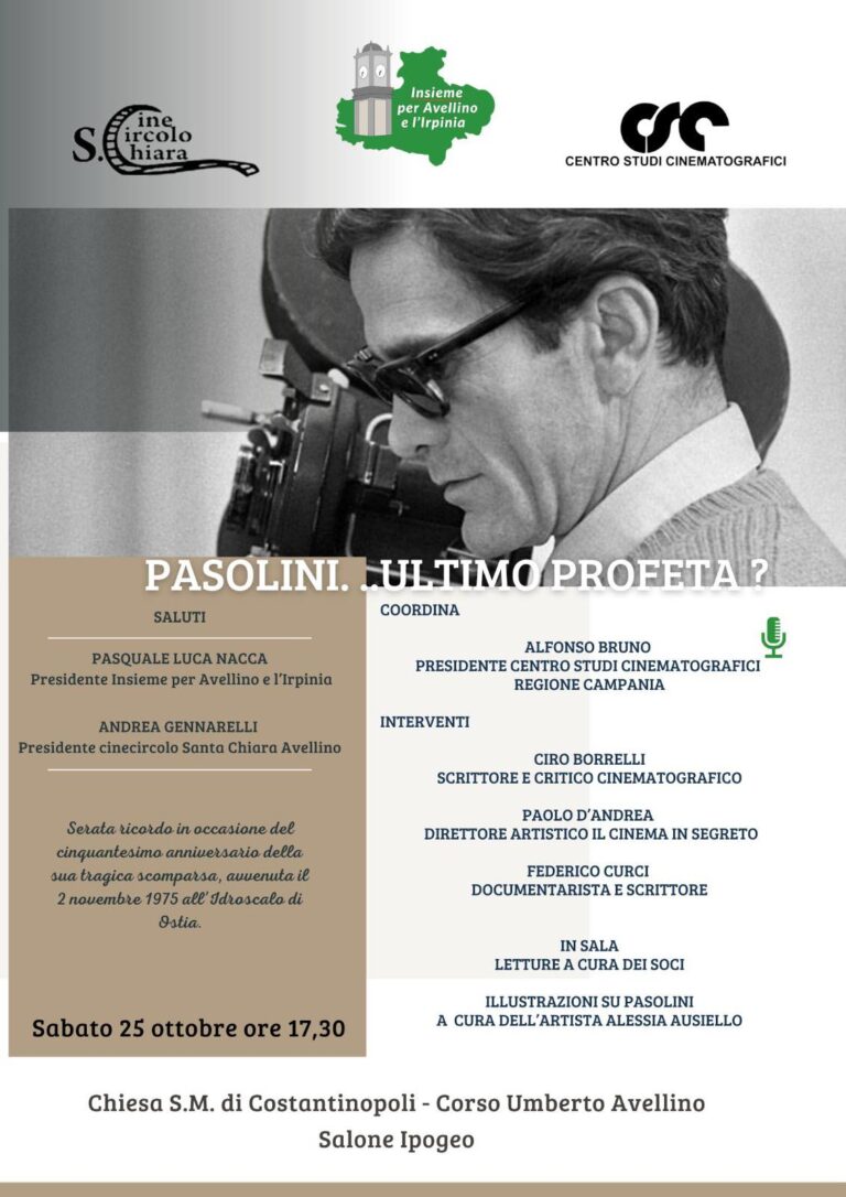Un doveroso omaggio ad un grande del cinema italiano a 50 anni dalla scomparsa, Una riflessione dedicata a “Pasolini…Ultimo profeta?” promossa dall’Associazione Avellino per il mondo in collaborazione con il Cinecircolo Santa Chiara e il Centro Studi Cinematografici. E’ l’incontro in programma il 25 ottobre nella chiesa di Costantinopoli. A portare i propri saluti Pasquale Luca Nacca, presidente Avellino per…