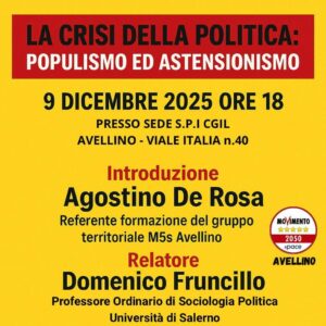 E’ dedicato alla “Crisi della politica: populismo ed astensionismo” il convegno in programma il 9 dicembre, alle 18, ad Avellino, presso la sede dello SPI CGIL in viale Italia 40, promosso dal Gruppo territoriale di Avellino del Movimento 5 Stelle,…