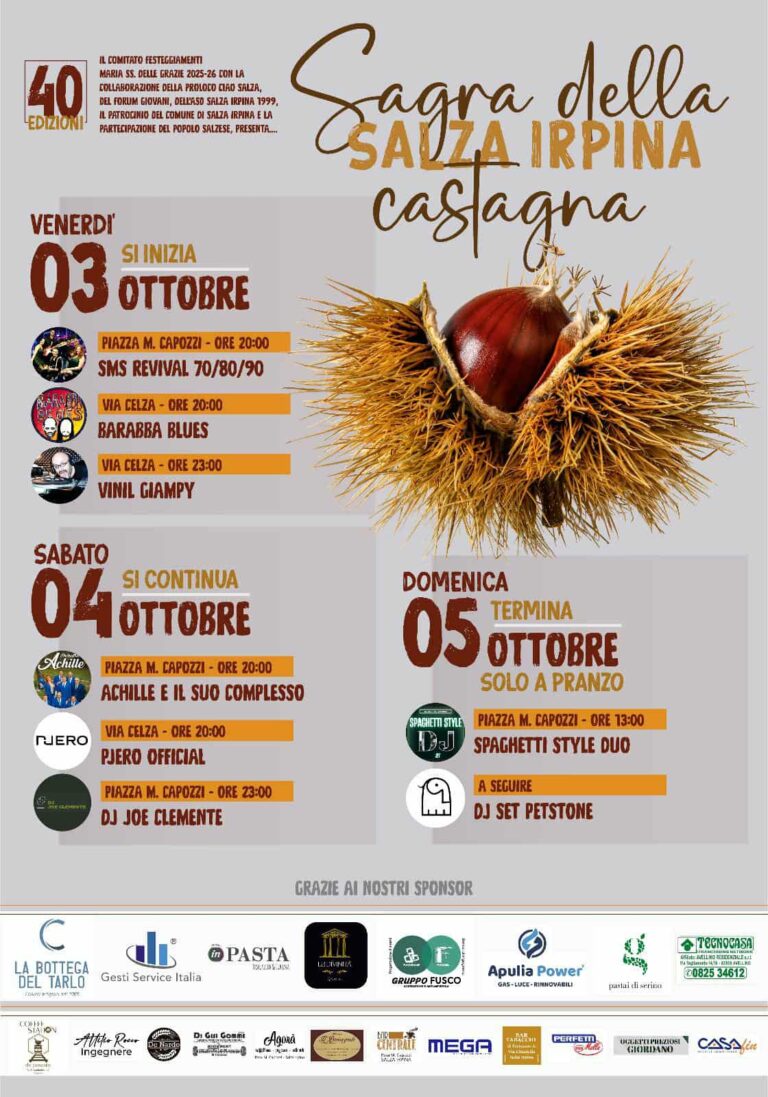 Quarant’anni di amore per la propria terra, per le tradizioni dei nostri nonni e per un paese che non smette mai di emozionare. A Salza Irpina torna la Sagra della Castagna, per la sua 40ª edizione. Da venerdì 3 a domenica 5 ottobre 2025, la kermesse si rinnova con un programma ricchissimo e un menù che unisce la cucina contadina…