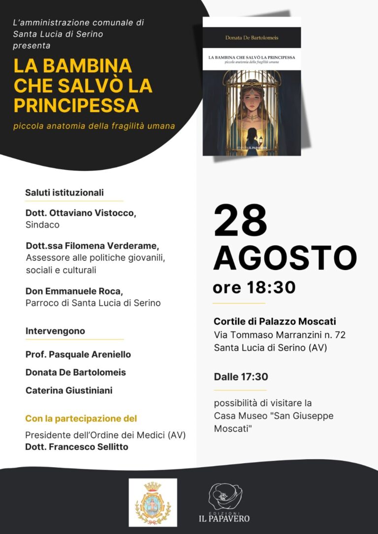Sarà il giardino di Casa Moscati, a Santa Lucia di Serino, ad accogliere il 28 agosto, alle 18.30, la presentazione del libro “La bambina che salvò la principessa. Piccola anatomia della fragilità umana” di Donata De Bartolomeis, edito dalla casa editrice Il Papavero. Il volume affronta, con delicatezza e profondità, il tema della fragilità umana, intesa non come limite ma come…