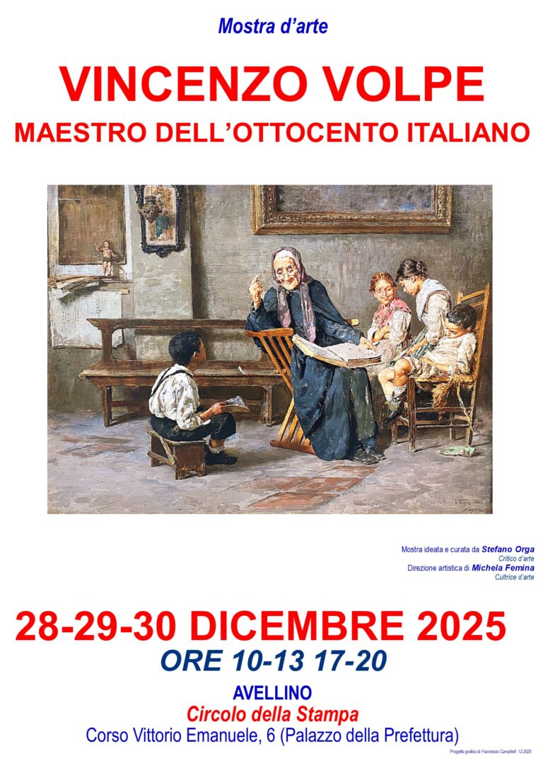 Dal 28 al 30 dicembre 2025 il Circolo della Stampa di Avellino ospita la mostra “Vincenzo Volpe. Maestro dell’Ottocento italiano”, un importante appuntamento culturale che celebra i 170 anni dalla nascita del pittore grottese e restituisce piena visibilità a una delle figure più significative della pittura italiana tra la fine dell’Ottocento e i primi decenni del Novecento. L’iniziativa si propone non solo come…
