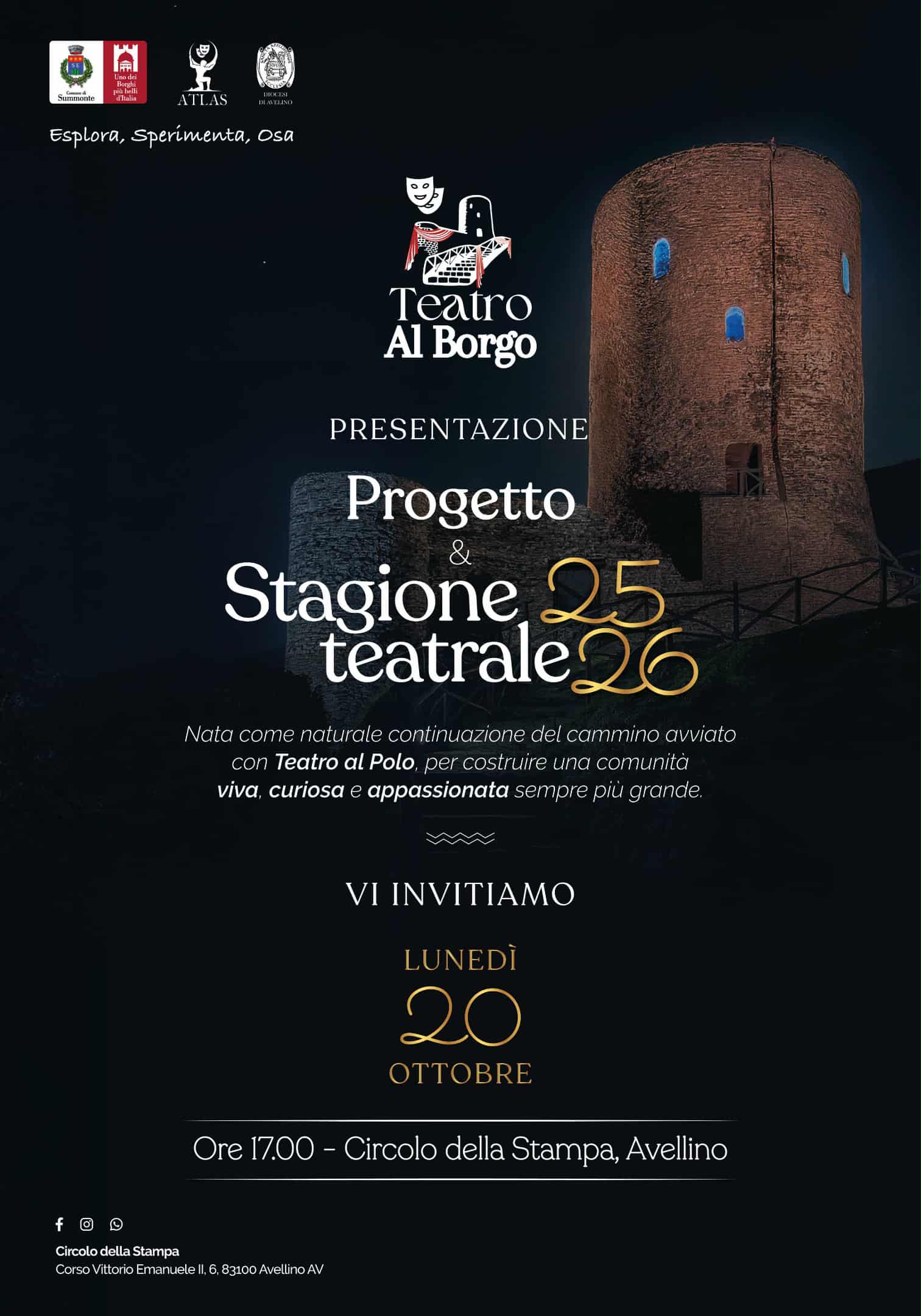 Prende il via il progetto “Teatro al Borgo*, nuova estensione naturale del progetto “Teatro al Polo”: un progetto ideato da ATLAS in collaborazione con la Diocesi di Avellino e il Comune di Summonte e nato per far crescere anche a Summonte una piccola comunità, viva e partecipata, sul modello di quella sviluppata ad Avellino. L’obiettivo è coinvolgere le realtà del territorio — associazioni, scuole, parrocchie, gruppi informali e cittadini — offrendo una rassegna teatrale di qualità, occasioni di incontro e spazi di formazione e collaborazione. Il calendario, le collaborazioni e la visione del progetto “Teatro al Borgo” saranno illustrati nella presentazione ufficiale che si terrà lunedì 20 ottobre, alle 17, al Circolo della Stampa di Avellino L’incontro è aperto a tutta la cittadinanza, alle realtà culturali e alle numerose compagnie esterne che parteciperanno alla rassegna.