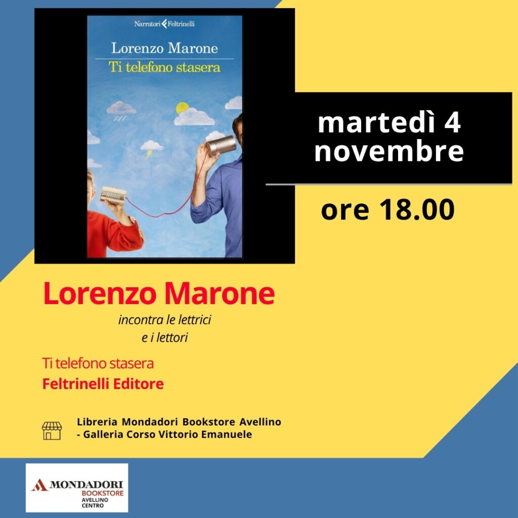 Lorenzo Marone, tra gli scrittori più amati della scena partenopea, torna ad Avellino alla libreria Mondadori Bookstore per presentare il suo ultimo romanzo “Ti telefono stasera” (Feltrinelli). Appuntamento Martedì 4 novembre, alle 18. A dialogare con Marone la blogger Cristina Di Matteo. Il libro si fa racconto di una famiglia attualissima – con le sue complicazioni, il caos e l’invincibile voglia di far prevalere la fantasia – e di un rapporto tra padre e figlio di cui Lorenzo Marone illumina con sguardo partecipe fragilità e slanci temerari, paure e desideri. E attraverso la bellezza dell’imperfezione restituisce un nuovo, profondo significato all’essere padre oggi.
