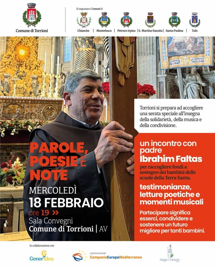 Mercoledì 18 febbraio, alle ore 19, la Sala Convegni del Comune di Torrioni ospiterà l’iniziativa “Parole, poesie e note”, incontro speciale con Padre Ibrahim Faltas dedicato alla raccolta fondi per i bambini delle scuole della Terra Santa.
