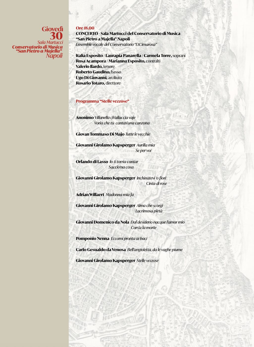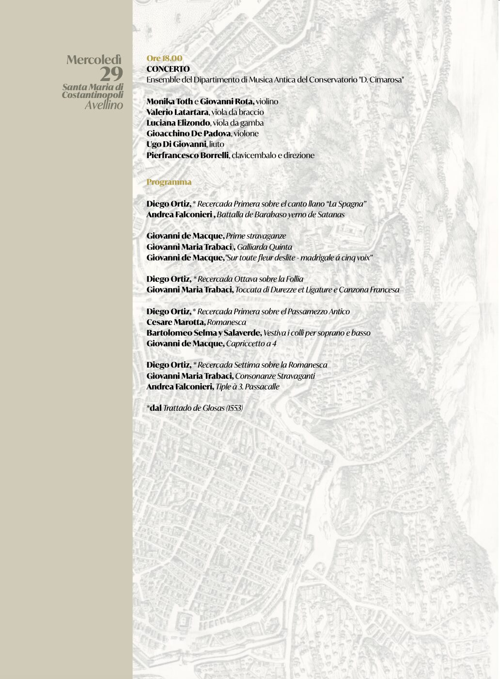 Il convegno indagherà la produzione musicale dei maestri stranieri attivi nella Napoli del XVI secolo, i rapporti con le maestranze locali, la committenza e i luoghi della musica del Cinquecento. Studiosi di fama internazionale, provenienti da università e conservatori italiani e stranieri, si alterneranno nelle due giornate convegnistiche di Avellino e Napoli. Previsti anche concerti di musica antica con ensemble del Conservatorio.