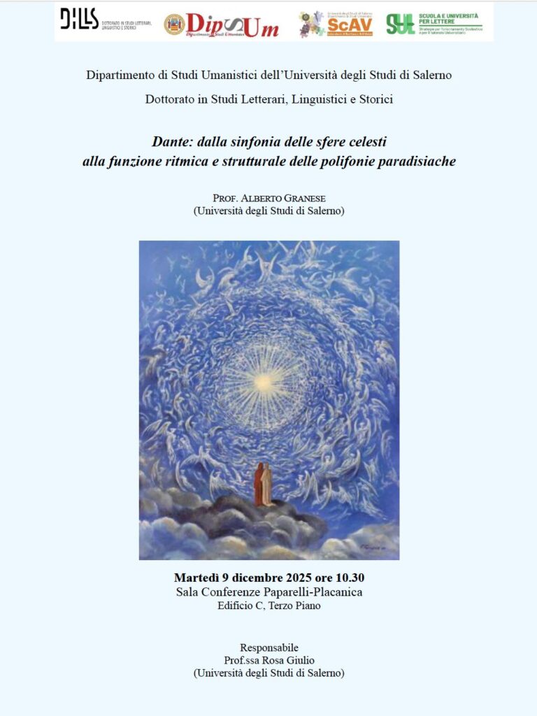 Una riflessione sull ‘universo di Dante “Dalla sinfonia delle sfere celesti alla funzione ritmica e strutturale delle polifonie paradisiache”. E’ il titolo dell’incontro promosso dal Dipartimento di Studi Umanistici dell’Università degli Studi di Salerno Dottorato in Studi Letterari, Linguistici e Storici. Relazionerà il professore Alberto Granese, in programma martedì 9 dicembre 2025 ore 10.30 Sala Conferenze Paparelli-Placanica ù