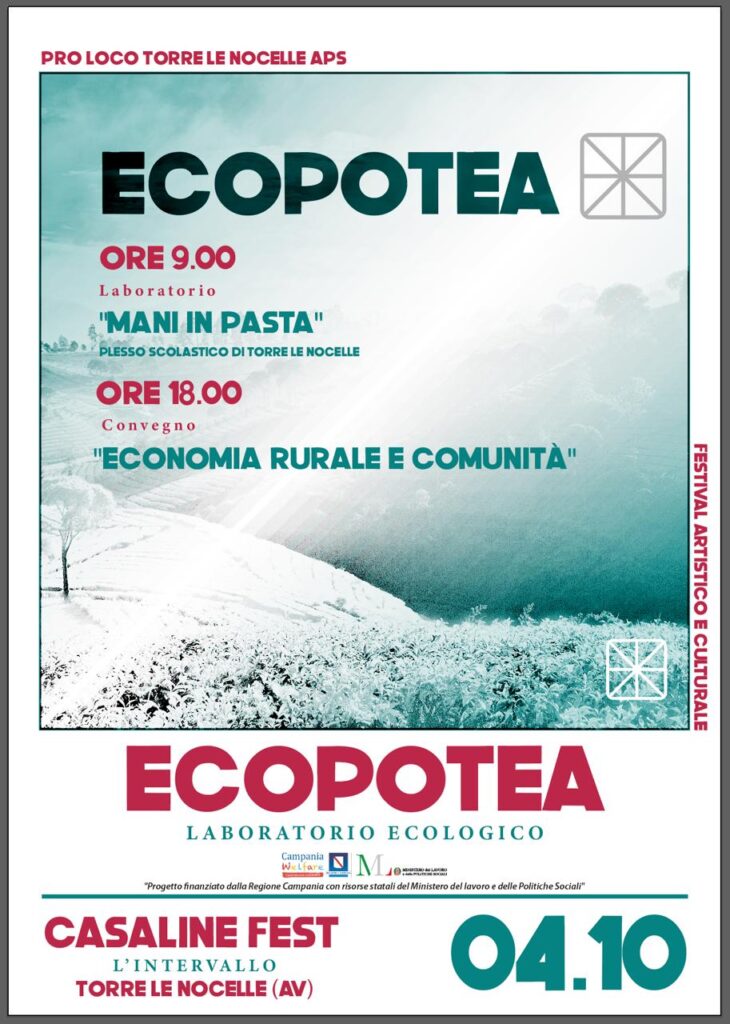 Ripartire dai territori, valorizzando il patrimonio ambientale e gli antichi saperi, ma pure con il coraggio di uno sguardo che sappia ripensarli verso il futuro: questo, in sintesi, il senso dell’iniziativa de “La terra nelle nostre mani”. Tre associazioni impegnate (Ecopotea, Maestra Sara e Al centro dei ragazzi Aps) su cinque Comuni della Valle del Calore coinvolti (Venticano, Pietradefusi, Montefusco, Montemiletto e Torre Le Nocelle), per un progetto che fa della comunità la sua protagonista. Partito a giugno, il percorso si rinnova domani, sabato 4 ottobre, con un doppio appuntamento nell’ambito del “Casaline Fest”, il festival artistico e culturale di Torre Le Nocelle.