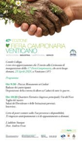 Giovedì 23, a partire dalle ore 9,30, la cerimonia di inaugurazione in Piazza Monumento ai Caduti con la tradizionale deposizione della corona di alloro al Monumento dei Caduti sotto lo sguardo di tutti i Sindaci irpini e sanniti, invitati per l’occasione dall’Amministrazione comunale guidata dal sindaco Arturo Caprio. A seguire il taglio del nastro presso il Quartiere Fieristico dove, grazie all’attenta regia del Presidente della Pro Loco Venticanese guidata da Daniel Panella, tutto è pronto per accogliere autorità, ospiti di eccellenza e visitatori.