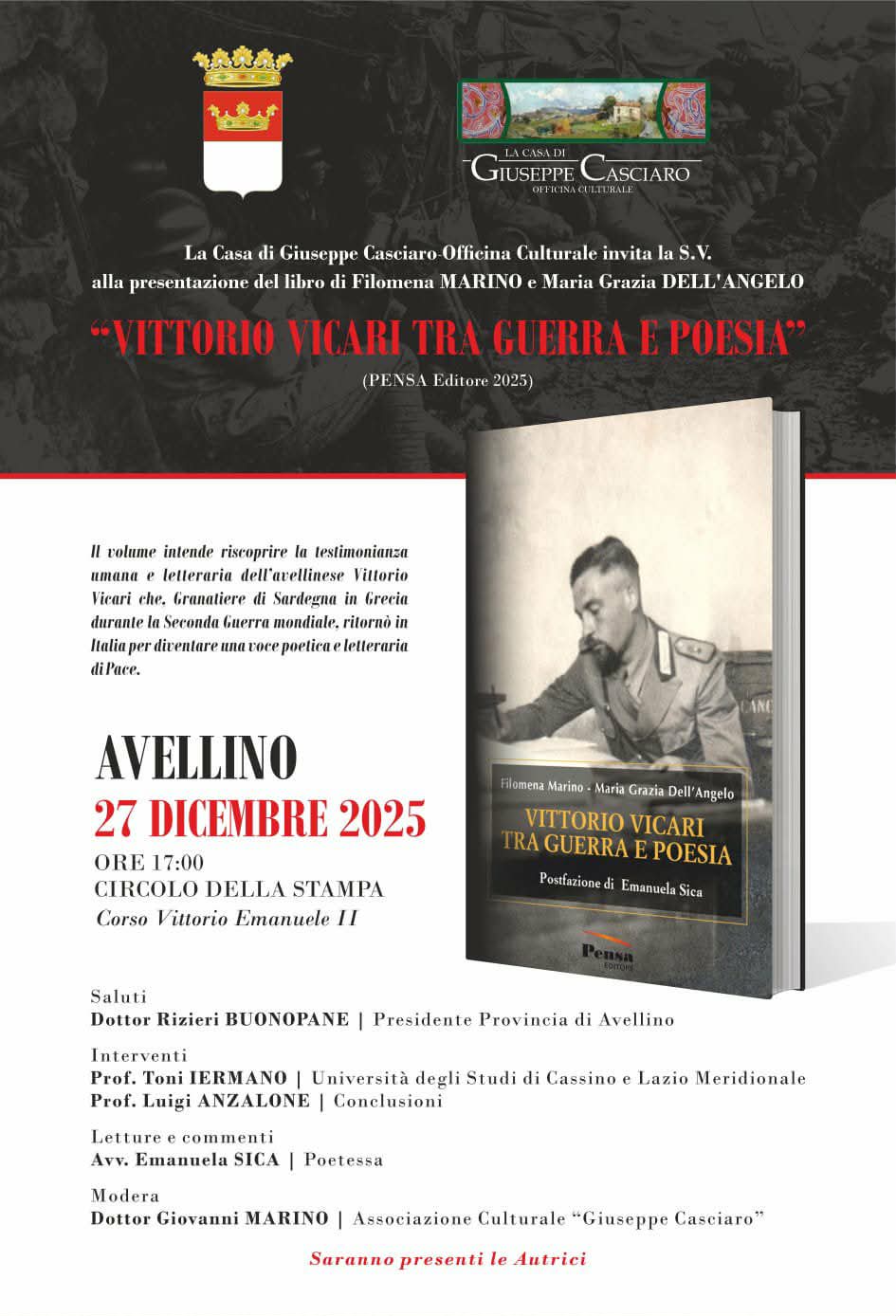 Diventa l’occasione per riscoprire la figura di una voce poetica di pace il volume di Filomena Marino e Maria Grazia Dell’Angelo “Vittorio Vicari tra guerra e poesia”, Pensa edizioni. Sarà presentato il 27 dicembre, alle 17, al Circolo della stampa. Interverranno il presidente della Provincia di Avellino Rizieri Buonopane, il professore Toni Iermano dell’Università di Cassino e il professore Luigi Anzalone. Ad impreziosire l’incontro le letture di Emanuela Sica. Modera Gianni Marino dell’associazione “Giuseppe Casciaro”. Il volume vuole essere un omaggio alla memoria dell’avellinese Vittorio Vicari, granatiere di Sardegna in Grecia durante la Seconda Guerra Mondiale, ritornato in Italia per diventare una voce poetica e letteraria di pace. “Il fortunoso incontro tra il figlio Osvaldo e la curatrice di questo libro – spiega Marino – ha permesso di riportare alla luce una eredità culturale spirituale stupefacente: un soldato che diventa poeta e sa esprimere con sincerità il travaglio vissuto. Il lavoro di Filomena Marino ci consegna una testimonianza che in tempi rischiosi e terremotati ci esorta a non considerare la Pace come manna caduta dal cielo ma una lenta progressiva conquista che non è facile conservare. Vicari ci illumina come una stella polare. Al lettore il compito di far tesoro di una straordinaria lezione di vita”
