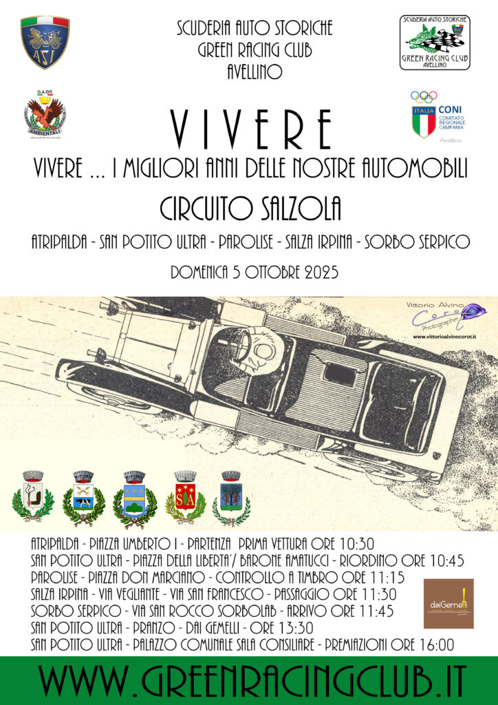 Domenica, 5 ottobre si svolgerà la prima edizione di “Vivere …… vivere, i migliori anni delle nostre Automobili”. Si tratta di un nuovo Evento di Motori organizzato dalla Scuderia Auto Storiche Green Racing Club di Avellino (Club Federato all’Automotoclub Storico Italiano) che riprende una tipologia di manifestazione già sperimentata negli anni scorsi. Non sarà una gara, non un evento a tempo, ma ogni equipaggio partecipante potrà godere della propria autonomia nell’ambito del tracciato indicato. La definizione del tracciato da percorrere ha portato, il Club organizzatore, alla determinazione del “Circuito Salzola” (dall’omonimo fiume) che interesserà, in sequenza, i Centri Storici dei comuni di Atripalda, San Potito Ultra, Parolise, Salza Irpina e Sorbo Serpico. Quindi la manifestazione ha registrato il patrocinio di tutti i comuni attraversati, oltre che del CONI provinciale presieduto dal prof. Giuseppe Saviano.