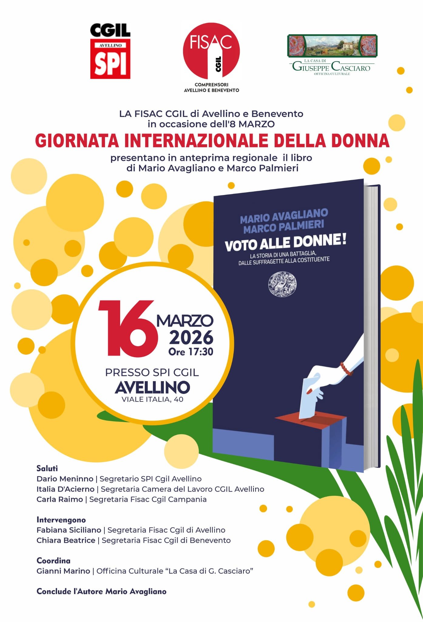 In occasione della Giornata Internazionale della Donna, la FISAC CGIL dei comprensori di Avellino e Benevento promuove un confronto dedicato alla storia dei diritti femminili e alla conquista del voto in Italia. Lunedì 16 marzo, alle ore 17.30, presso la sede SPI CGIL di Avellino in Viale Italia 40, sarà presentato in anteprima regionale il libro “Voto alle donne! La storia di una battaglia, dalle suffragette alla Costituente”, scritto da Mario Avagliano e Marco Palmieri. L’incontro nasce dalla volontà di ricostruire il lungo percorso che ha portato le donne alla conquista del diritto di voto e alla piena partecipazione alla vita democratica del Paese, attraverso un racconto storico che parte dalle lotte delle suffragette fino al ruolo fondamentale delle donne nell’Assemblea Costituente. Ad aprire l’incontro saranno i saluti istituzionali di: Dario Meninno, Segretario SPI CGIL Avellino Italia D’Acierno, Segretaria Camera del Lavoro CGIL Avellino Carla Raimo, Segretaria FISAC CGIL Campania Seguiranno gli interventi di: Fabiana Siciliano, Segretaria FISAC CGIL Avellino Chiara Beatrice, Segretaria FISAC CGIL Benevento A coordinare l’incontro sarà Gianni Marino, dell’Officina culturale La Casa di Giuseppe Casciaro. A concludere l’evento sarà uno degli autori del volume, Mario Avagliano, che dialogherà con il pubblico sul significato storico e civile della conquista del voto alle donne e sulla sua eredità nella società contemporanea. L’appuntamento rappresenta un’occasione di approfondimento culturale e storico, ma anche un momento per riflettere sul valore dell’uguaglianza, della partecipazione democratica e sul ruolo delle donne nella costruzione della Repubblica.