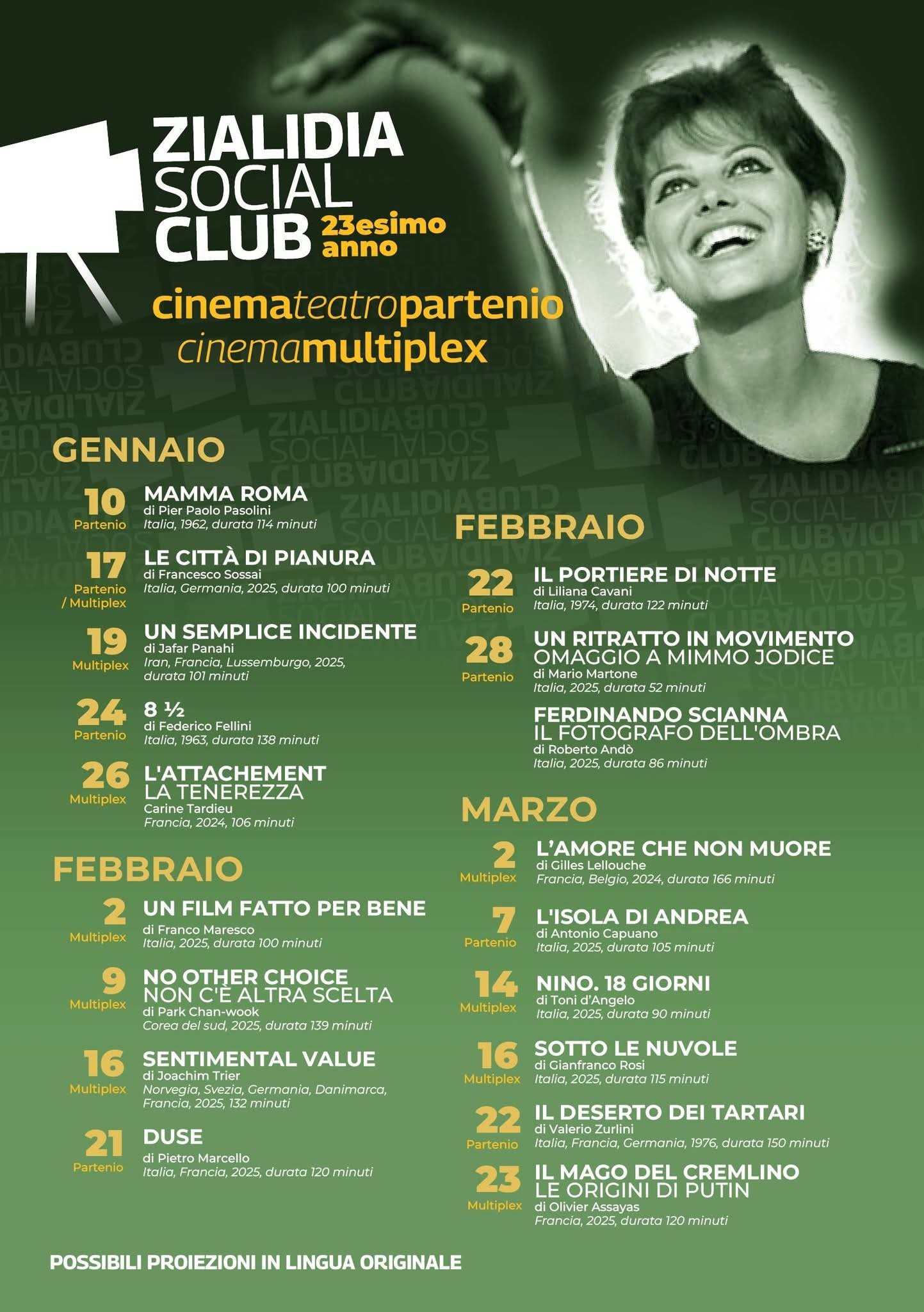 Poi spazio il 24 gennaio a 8 ½ con l’omaggio a Fellini e il 26 gennaio a L’attachement – La tenerezza. Nel mese di febbraio la rassegna prosegue con Un film fatto per bene, No Other Choice – Non c’è altra scelta, Sentimental Value, Duse, Il portiere di notte e Un ritratto in movimento. Omaggio a Mimmo Jodice. Il mese si chiude con l’incontro dedicato a Ferdinando Scianna. Il fotografo dell’ombra, ampliando lo sguardo oltre il cinema verso la fotografia. A marzo il programma propone L’amore che non muore, L’isola di Andrea, Nino, 18 giorni, Sotto le nuvole, Il deserto dei tartari e Il mago del Cremlino. Le origini di Putin, offrendo una riflessione intensa su memoria, storia e attualità. Il cartellone di aprile comprende Una cosa vicina, Ecce Bombo, Porte aperte, La piccola Amélie, Noi e la grande ambizione e Mio fratello è un vichingo, un mese che alterna ironia, impegno civile e cinema d’autore. Nel mese di maggio sono in programma Divine Comedy, La balia, Sirat, Nouvelle Vague, Lo straniero e Roberto Rossellini. Più di una vita. La rassegna include inoltre Le pistolere e l’evento speciale La ragazza con la valigia, arricchendo ulteriormente l’offerta culturale nel segno di Claudia Cardinale. A giugno è prevista la proiezione di Senza pelle, mentre la rassegna si conclude a luglio con Gente di Roma, chiudendo idealmente il percorso con uno sguardo corale e umano sulla realtà contemporanea.